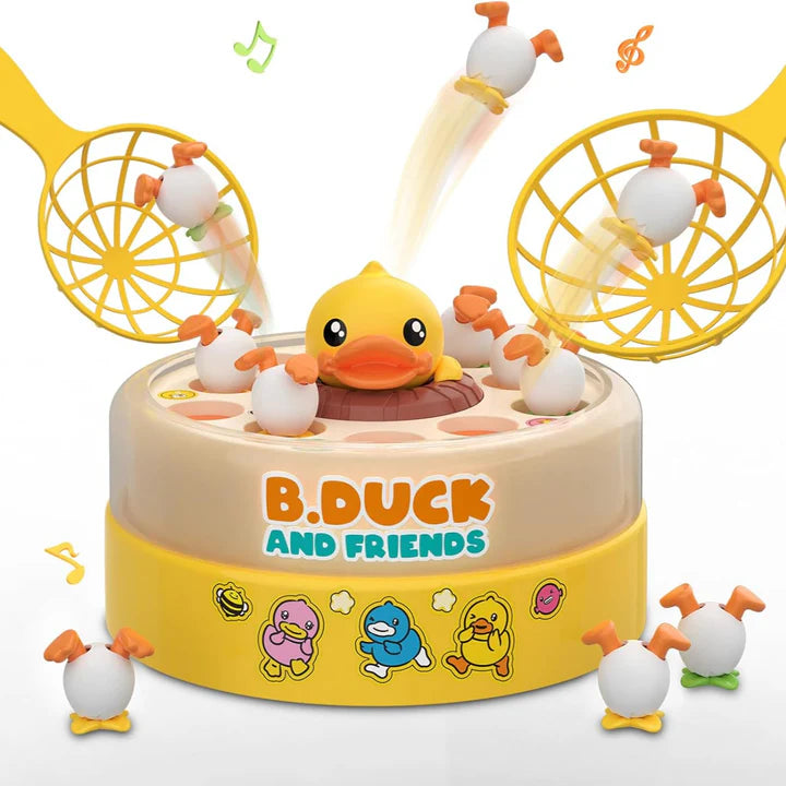 اللعبة عبارة عن منصة دوّارة تطلع بطّات قافزة بسرعة، والطفل لازم يصيدها بالشبكة قبل ما تختفي.